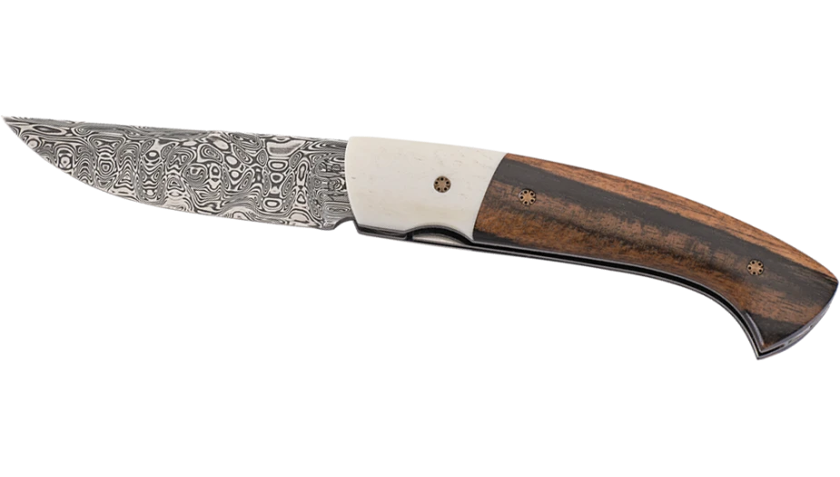 Découvrez notre nouvelle collection Masaï avec ce magnifique couteau en Os de Buffle et ébène du Cameroun. Il est présenté avec une lame damas finition Ice Blade. L’entretoise est travaillée comme un bouclier Masaï, avec un insert d’ébène et une perle dorée.